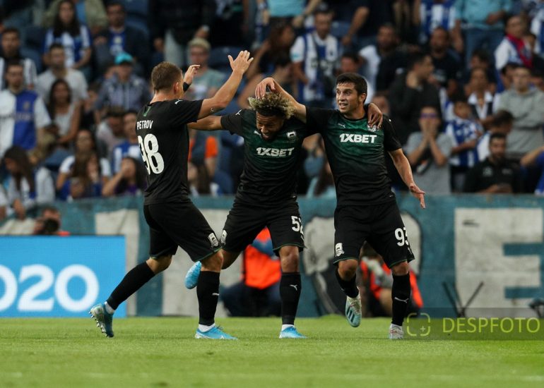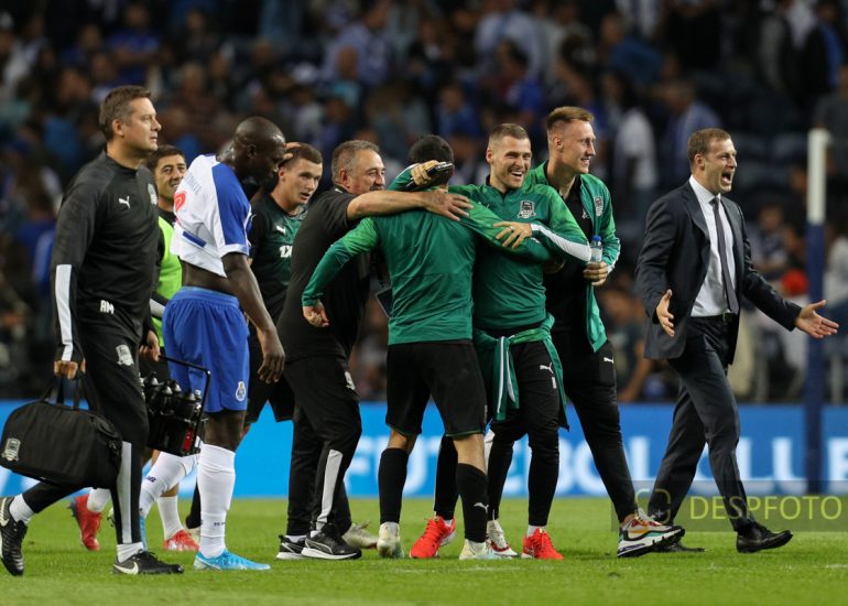 Krasnodar players celebrates the victory in the match and UEFA Champions League Qualification. FC Porto - FC Krasnodar, Third Qualifying Round at Dragao Stadium. UEFA Champions League 2019/2020. 20h:00, Aug 13, 2019, Porto, Portugal.