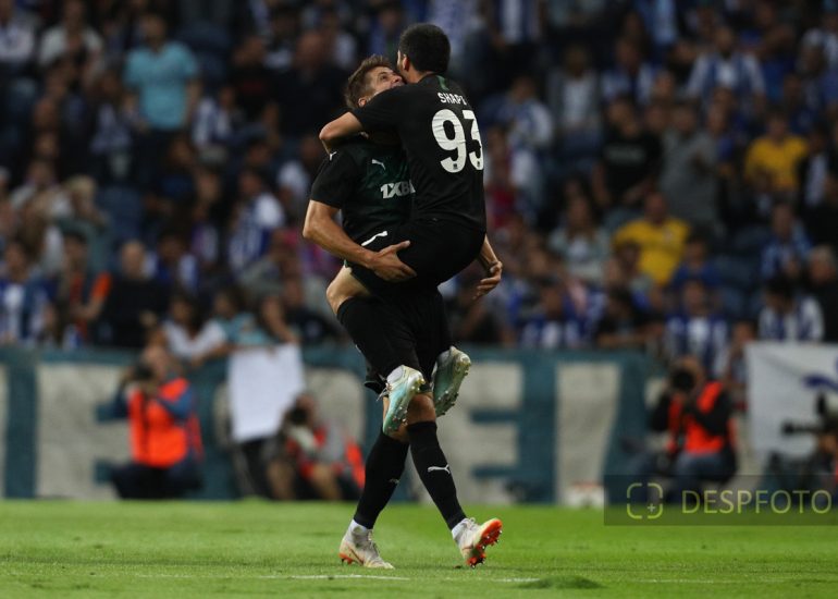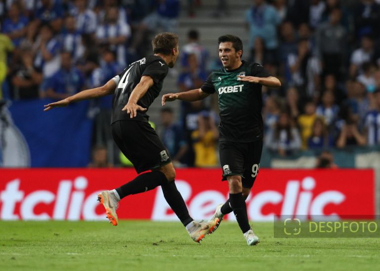 Magomed Suleymanov forward of FC Krasnodar (R) celebrates after scoring a goal FC Porto - FC Krasnodar, Third Qualifying Round at Dragao Stadium. UEFA Champions League 2019/2020. 20h:00, Aug 13, 2019, Porto, Portugal.
