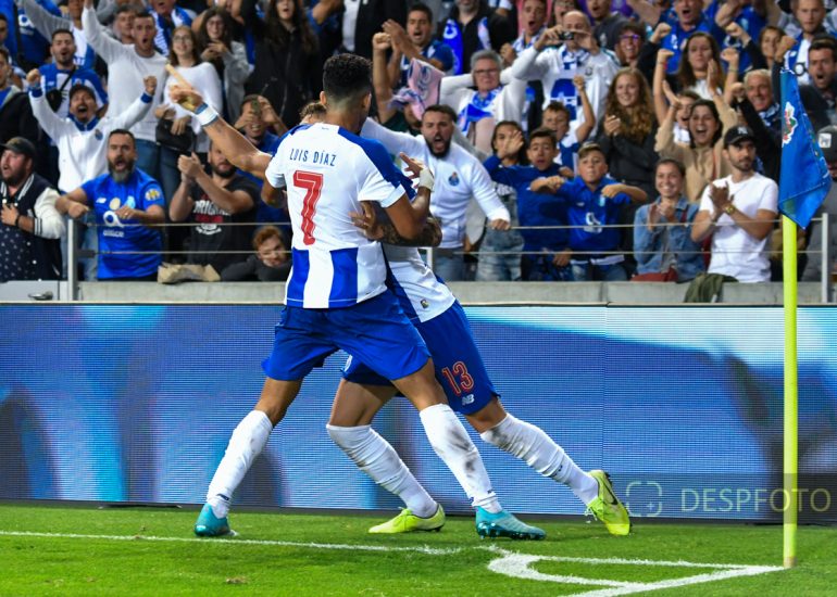 Porto’s Cape Verdean forward Ze Luis (R) celebrates after scoring a goal FC Porto - FC Krasnodar, Third Qualifying Round at Dragao Stadium. UEFA Champions League 2019/2020. 20h:00, Aug 13, 2019, Porto, Portugal.