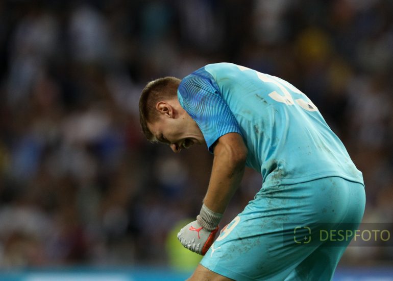 Matvei Safonov goalkeeper of FC Krasnodar celebrates the victory in the match and UEFA Champions League Qualification. FC Porto - FC Krasnodar, Third Qualifying Round at Dragao Stadium. UEFA Champions League 2019/2020. 20h:00, Aug 13, 2019, Porto, Portugal.