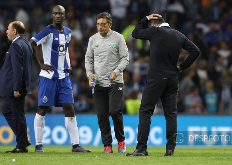 Porto's Portuguese head coach Sergio Conceicao and Porto's Portuguese midfielder Danilo Pereira reacts after missing the match. FC Porto - FC Krasnodar, Third Qualifying Round at Dragao Stadium. UEFA Champions League 2019/2020. 20h:00, Aug 13, 2019, Porto, Portugal.