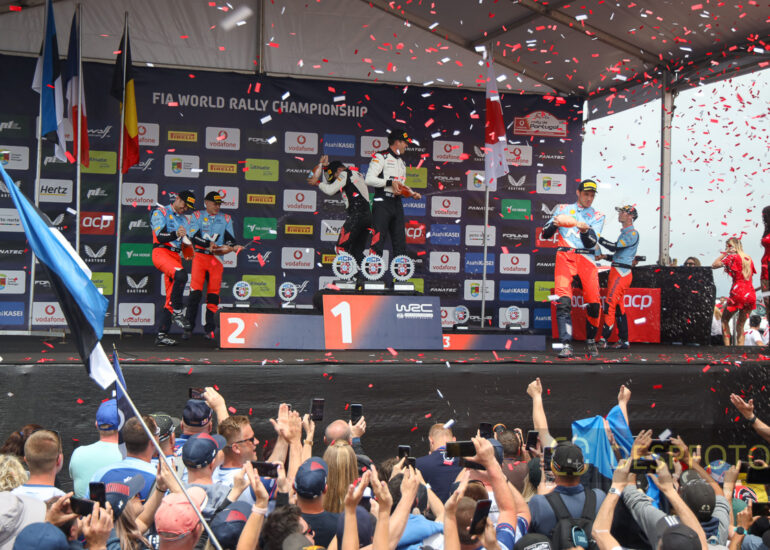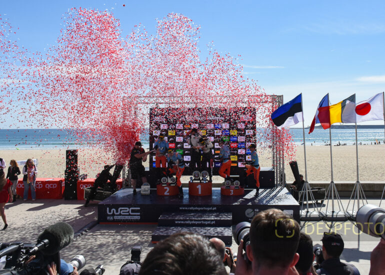Podium ceremony in Matosinhos, awarding trophies according to the classification of the various categories, WRC, WRC2, CPR. Podium party with teams and drivers. 09 ~ 12 May 2024, Portugal. © DESPFOTO 2024 - Worldwide Photo Agency